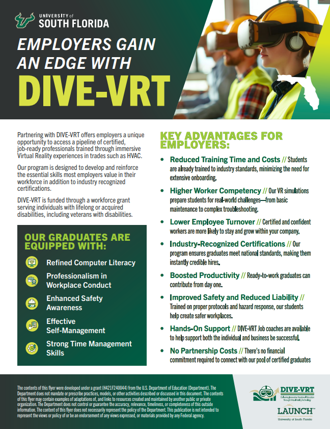 If your business would like to get involved, we welcome you to share your current apprenticeship or hiring processes—or we can work with you to create new ones. To learn more or schedule an initial call or meeting, please contact Scott Fontechia at 813-974-1153 or sfontech@usf.edu.