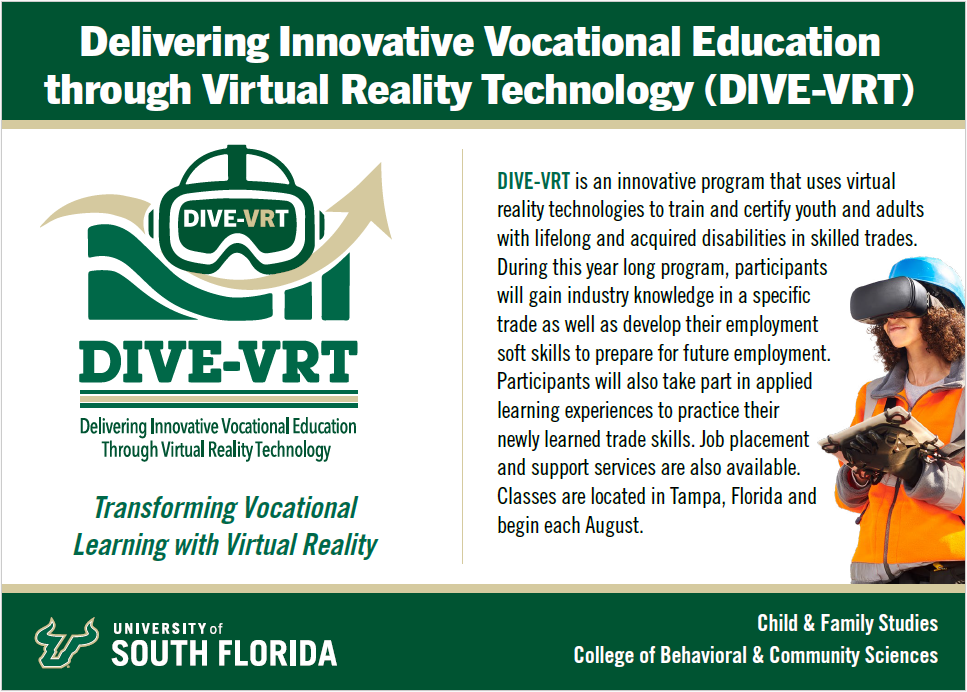 The Delivering Innovative Vocational Education Through Virtual Reality Technology (DIVE-VRT) program is designed to train and certify youth and adults with lifelong and acquired disabilities in skilled trades, providing them with the industry knowledge and employment soft skills necessary for future success.
